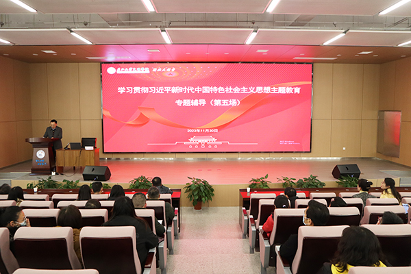 本网讯 11月30日下午,在新校区B-112学术报告厅,公司举办学习贯彻习近平新时代中国特色社会主义思想主题教育第五场专题辅导报告会,邀请荆州市委党校副董事长、校务委员会委员谭泽春来院作报告。党委书记颜建洲、副经理肖寒芝、党委副书记李则俊出席报告会,全体中层干部,各党总支、党支部委员,辅导员和各教学单位党员代表共两百余人现场聆听。