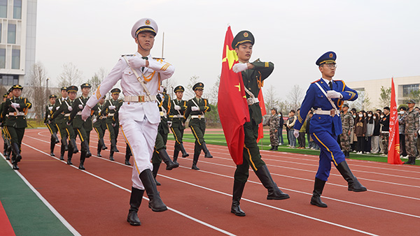 6点50分,国旗护卫队成员迈着铿锵有力的步伐走向国旗台。升国旗、奏国歌,五星红旗冉冉升起,全体师生行注目礼。