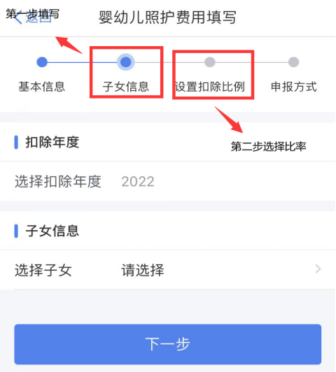 4.按APP步骤核对申报人信息、添加婴幼儿子女信息,选择夫妻双方扣缴比率