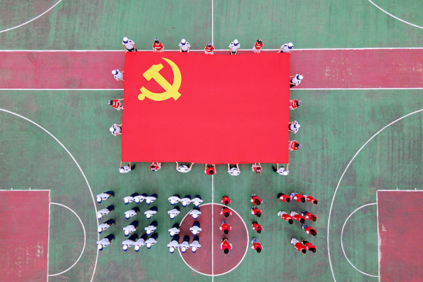 在消防救援大队门前,全体党员面对鲜红的党旗,高举右拳,重温入党誓词。在大队会议室,经济与法学系党总支副书记杨杉杉面向消防指战员和一批经法系老员工志愿者讲党课,加深大家对党史和新中国史的了解。讲课结束后,指战员和员工共同做手工,用大米拼成党徽、用粘土捏制党旗,在艺术体验中抒发爱党爱国热情。