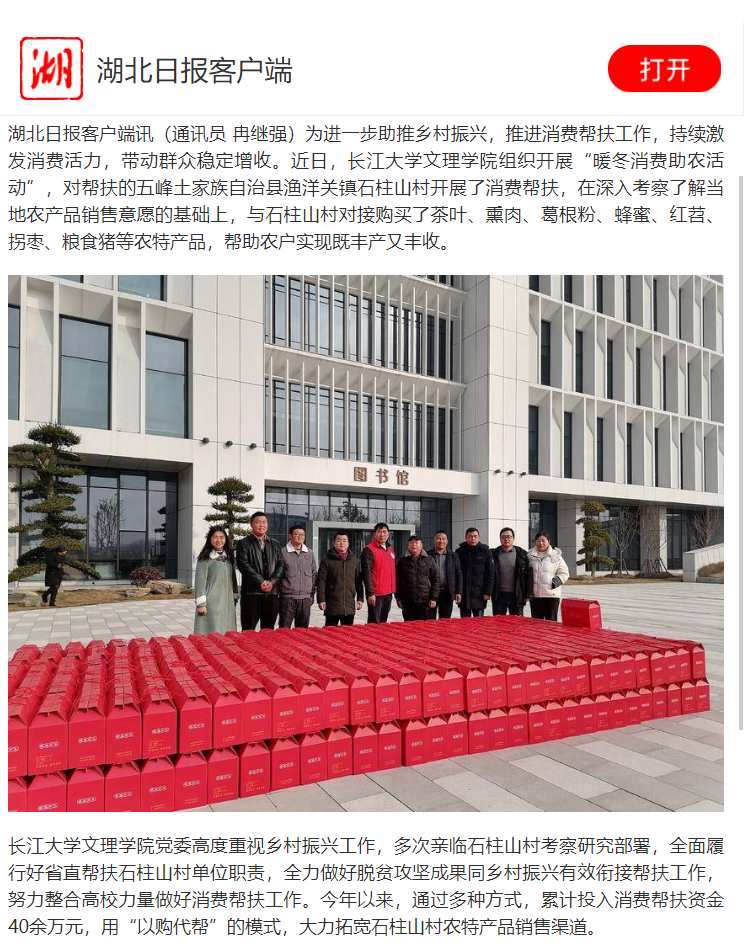 湖北日报客户端讯(通讯员 冉继强)为进一步助推乡村振兴,推进消费帮扶工作,持续激发消费活力,带动群众稳定增收。近日,beat365官网中文版本组织开展“暖冬消费助农活动”,对帮扶的五峰土家族自治县渔洋关镇石柱山村开展了消费帮扶,在深入考察了解当地农产品销售意愿的基础上,与石柱山村对接购买了茶叶、熏肉、葛根粉、蜂蜜、红苕、拐枣、粮食猪等农特产品,帮助农户实现既丰产又丰收。