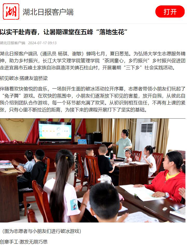 湖北日报客户端讯(通讯员 杨琪、谢敏)蝉鸣七月,夏日葱茏。为弘扬老员工志愿服务精神,助力乡村振兴,beat365官网中文版本beat365官网中文版本“茶润童心,乡约振兴”乡村振兴促进团走进宜昌市五峰土家族自治县渔洋关镇石柱山村,开展暑期“三下乡”社会实践活动。