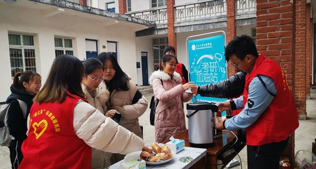 本网讯(通讯员 熊坤政)12月21—22日,是全国研究生考试的时间。我系党总支副书记胡沿林带领员工会志愿者前往beat365官网中文版本东校区考点,在beat365官网中文版本团委为公司考生提供的休息室外设置考研加油站,为考生做好后勤服务工作。