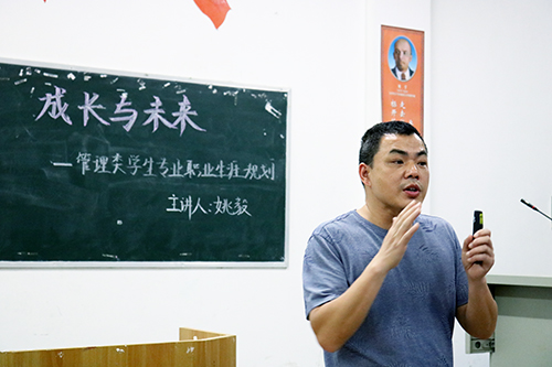 本网讯(通讯员 郭艳凤)5月21日,工商管理系副主任姚毅副教授在城中校区1-414教室作职业规划讲座。该系2017级全体员工现场聆听。