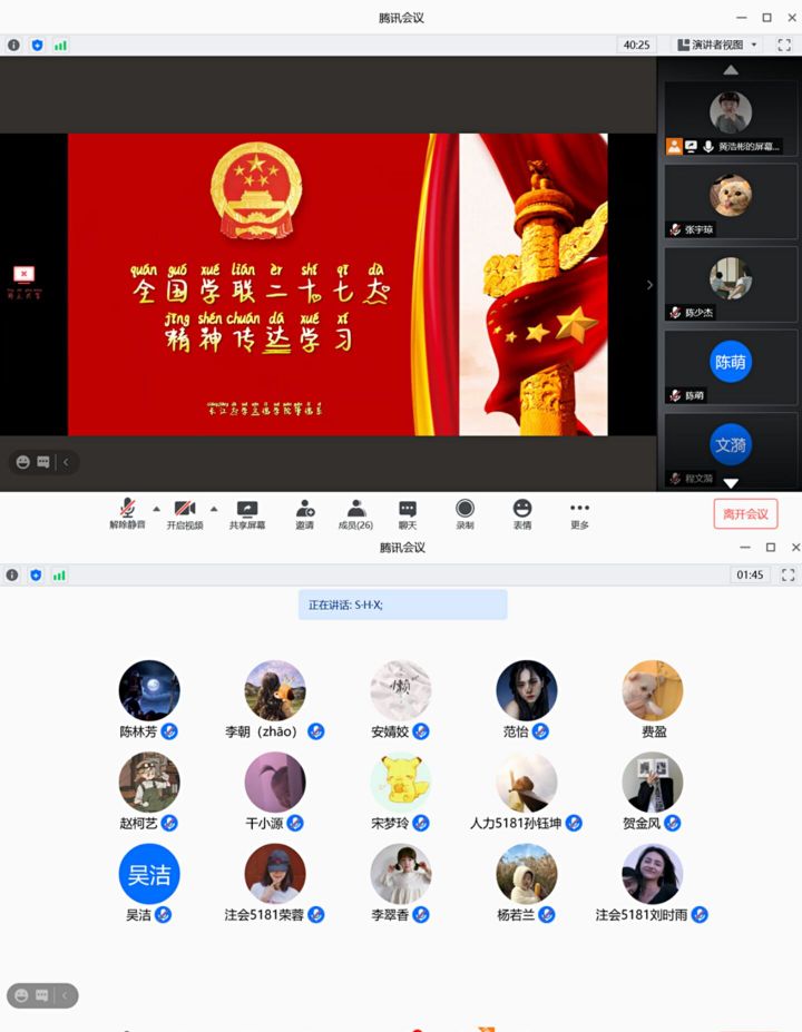 团课开始前,各班级团支书做了相应的准备工作,组织部成员按预先分配好的班级去检查团课情况,并通知团支书后期需要上交的具体材料,合理给各个班级相应的评分。团课主要围绕全国青联十三届全委会、全国学联二十七大会议内容及精神和习近平总书记贺信开展。会议强调,新时代青年处在中华民族发展的最好时期,既面临着难得的建功立业的人生际遇,也承载着伟大的时代使命,是实现中华民族伟大复兴的生力军。习近平总书记的贺信,更是体现了以习近平同志为核心的党中央对青年和青年工作的重视,对学联组织锐意改革、积极进取的认可,和对广大青年坚定跟党走、奋进新时代的期许。本次线上团课气氛活跃,同学们纷纷发表感悟,积极参与。“我们应该发奋成长成才,用新知识新思想新技能充实自己,使视野、观念、能力跟上越来越快的时代发展。”注会5191黄雅君说道。