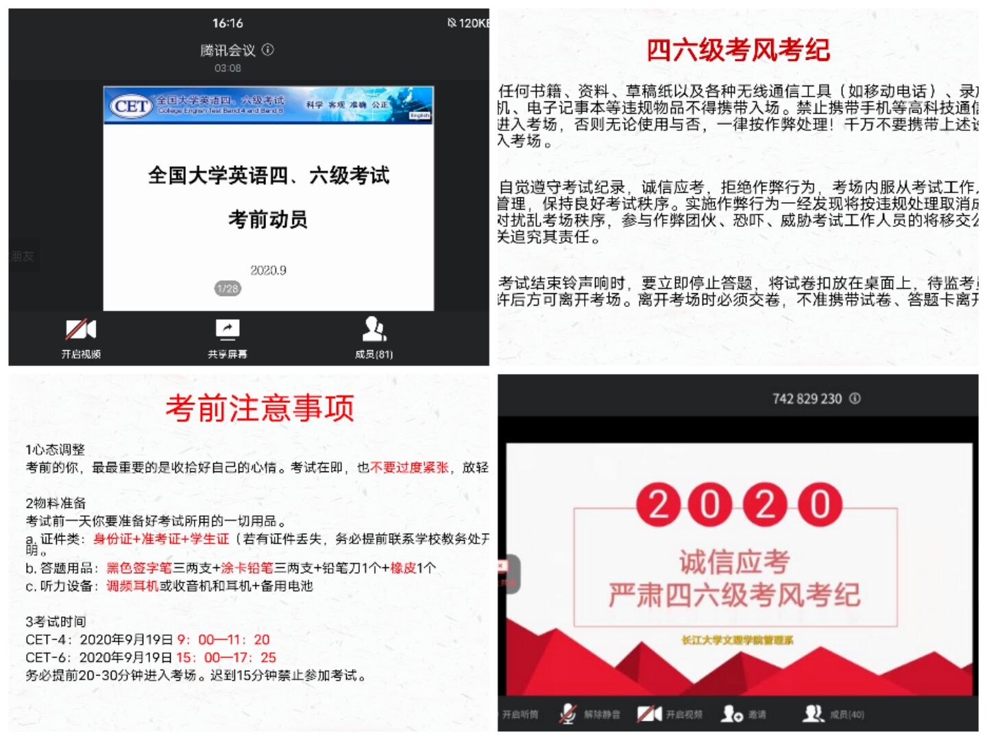 本网讯(通讯员 方婷 黄雅君)9月17日下午,我系于腾讯会议组织召开了英语四六级考前考风考纪教育大会,进一步激发同学们备考四六级的积极性,树立良好的学风,严肃考风考纪,加强老员工的诚信教育。