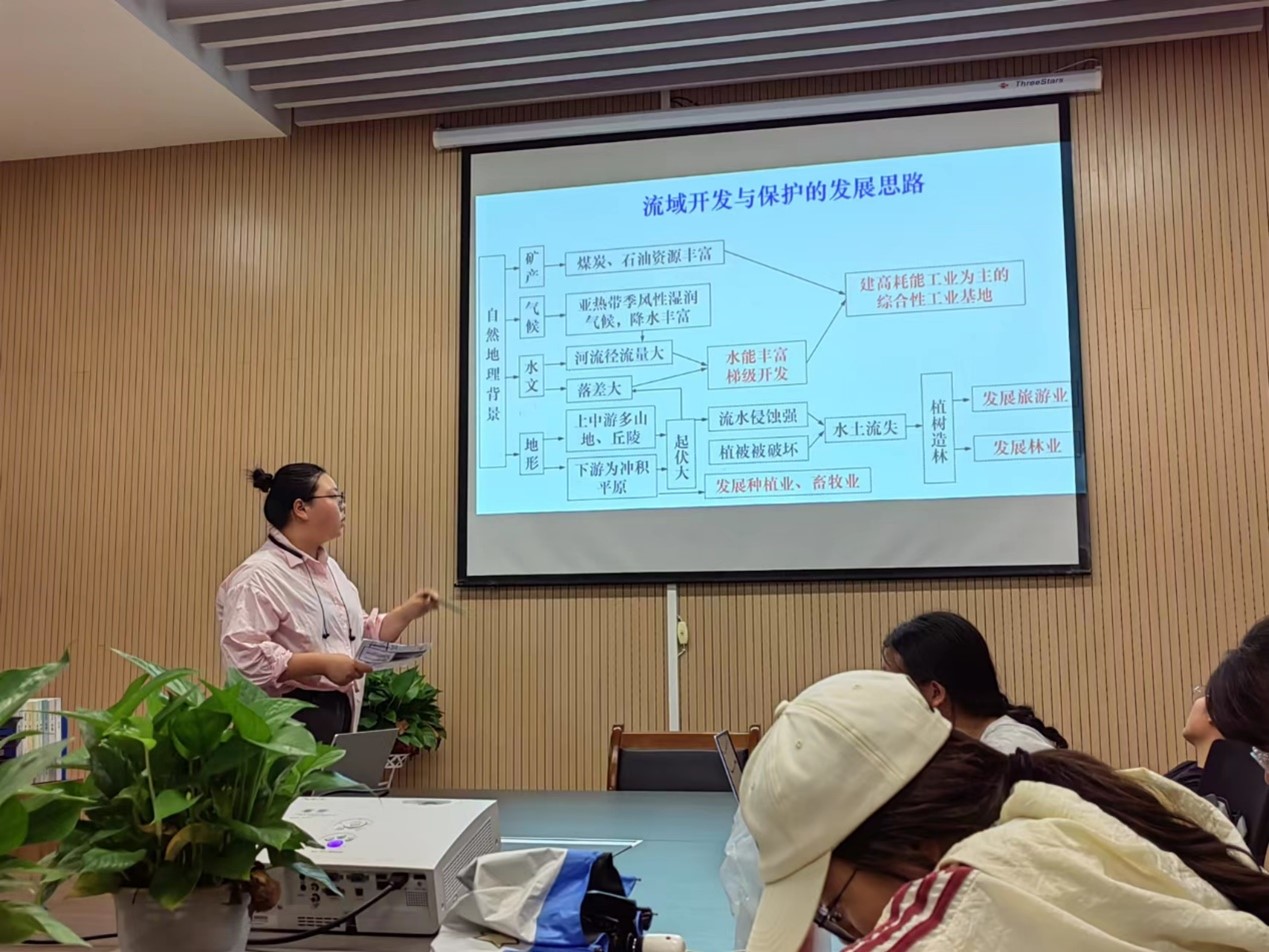 接着,纪舒瑶同学从流域调研的要求目标、河流特征、流域开发与保护的发展思路这三个方面为同学们进行了详细的讲解,主要介绍了流域调研要结合当地具体流域,根据流域的地理环境特征,掌握流域综合开发的一般方法和措施,说明流域内部协作开发水资源对荆楚特色乡村建设的意义。