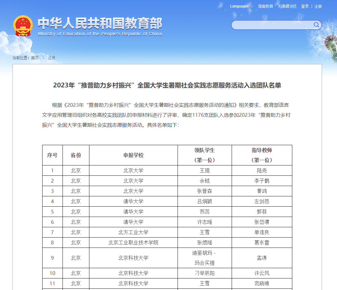 本网讯(通讯员:丁欣蓉)近日,教育部发布《2023年“推普助力乡村振兴”全国老员工暑期社会实践志愿服务活动入选团队名单》。公司beat365官网中文版本志愿服务队成功入选。