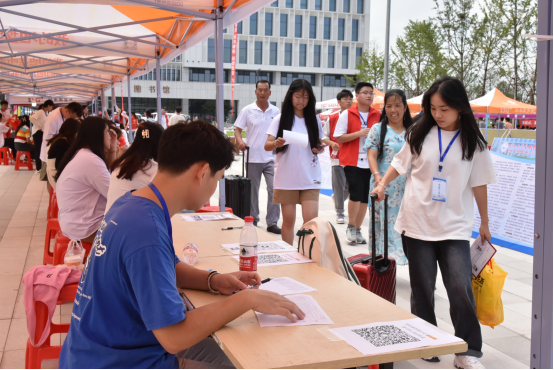 在新生接待处设置了入学资格审查、绿色通道、程序单领取处等多个迎新站点,负责的老师及100多名迎新志愿者精神饱满,统一佩戴迎新工作证,满怀热情地为新生入学提供保障。