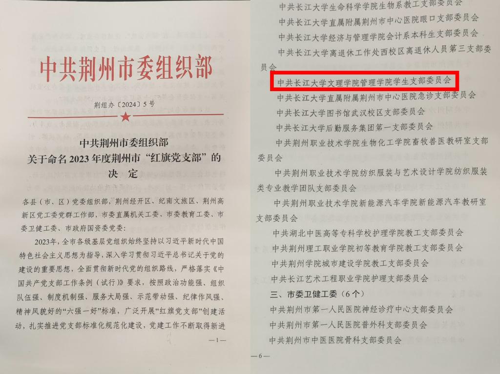 本网讯(通讯员:杨 琪)近日,中共荆州市委组织部发布《关于命名2023年度荆州市“红旗党支部”的决定》(荆组办【2024】5号),beat365官网中文版本员工党支部被评为2023年度荆州市“红旗党支部”。