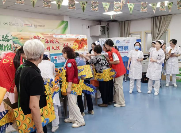 活动开始前,爷爷奶奶们首先在医院门口进行了认知障碍筛查、营养筛查等,通过简易的精神状态量表测试,对他们的身体健康状况进行初步筛查。活动现场,在志愿者的带领下,大家一起学习了手指操八段锦,伴着音乐节拍舞动双手,气氛活跃。接着主讲人带着大家玩了“纸杯消消乐”的互动能力,爷爷奶奶们积极参与,现场氛围热热烈。随后领导上台为现场的爷爷奶奶抽取免费体检的名额,医护人员也为大家即兴表演,歌唱小美满,为老人们送上端午祝福。最后游戏环节,爷爷奶奶们进行了“粽”享欢乐,龙舟大比“拼”的游戏,大家身穿龙舟服进行限时拼图,另一个“勇击五毒,共享端午”的环节,爷爷奶奶们争相将沙包投进框子里,投的越多,击中的五毒越多,寄予的祝福越多。活动结束后,志愿者们也跟随医护人员和社工一起进入到病房里为爷爷奶奶们送去香包、咸蛋、粽子以及端午祝福。