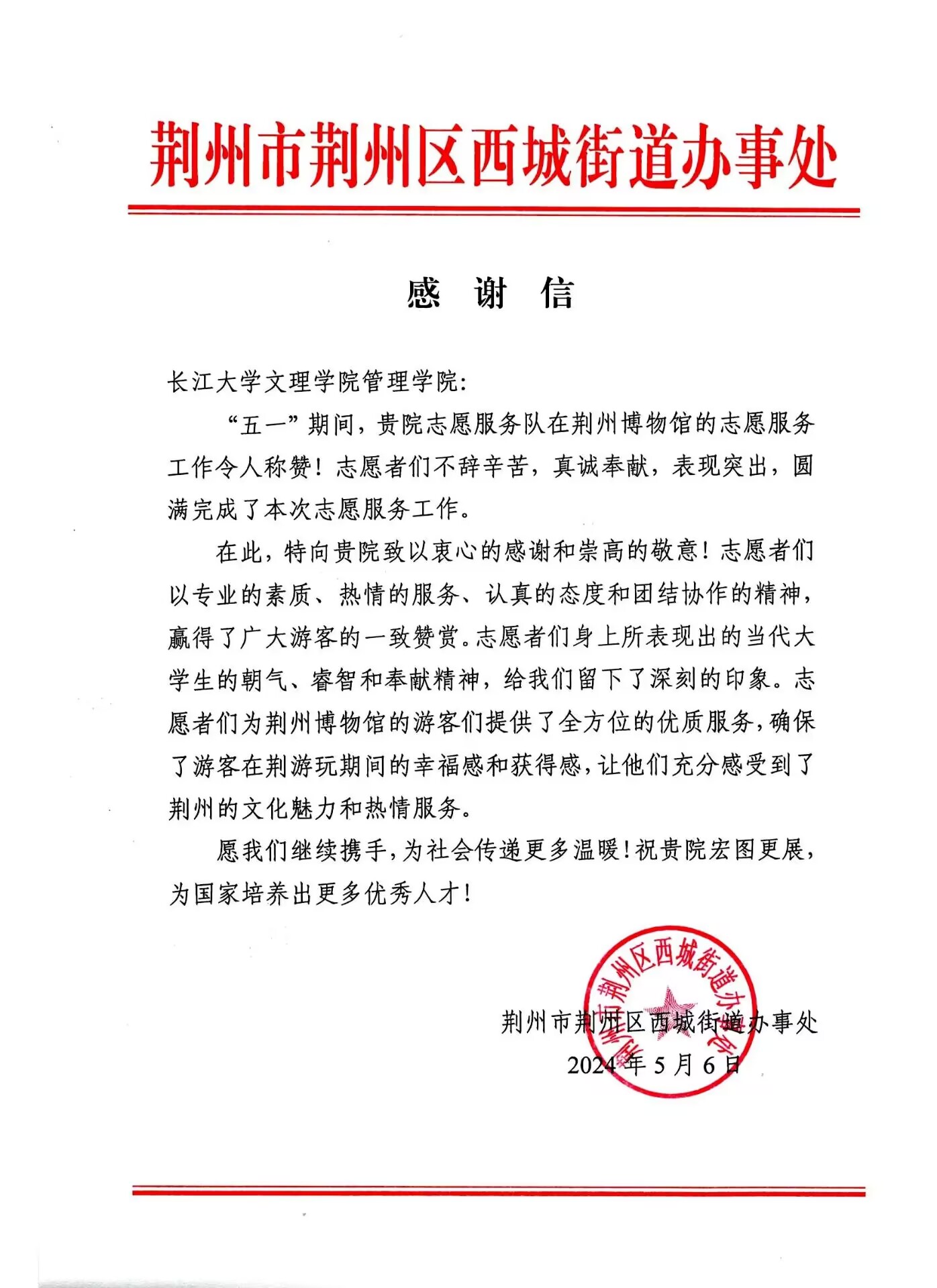 本网讯 近日,beat365官网中文版本beat365官网中文版本收到了一封来自荆州市荆州区西城街道办事处的感谢信,信中表达了对公司老员工志愿者的高度赞扬与诚挚谢意,感谢她们“五一”期间在荆州博物馆的志愿服务工作中不辞辛苦,真诚奉献,以专业的素质、热情的服务、认真的态度和团结协作的精神为游客提供了全方位的优质服务,为荆州文旅贡献了青春力量。