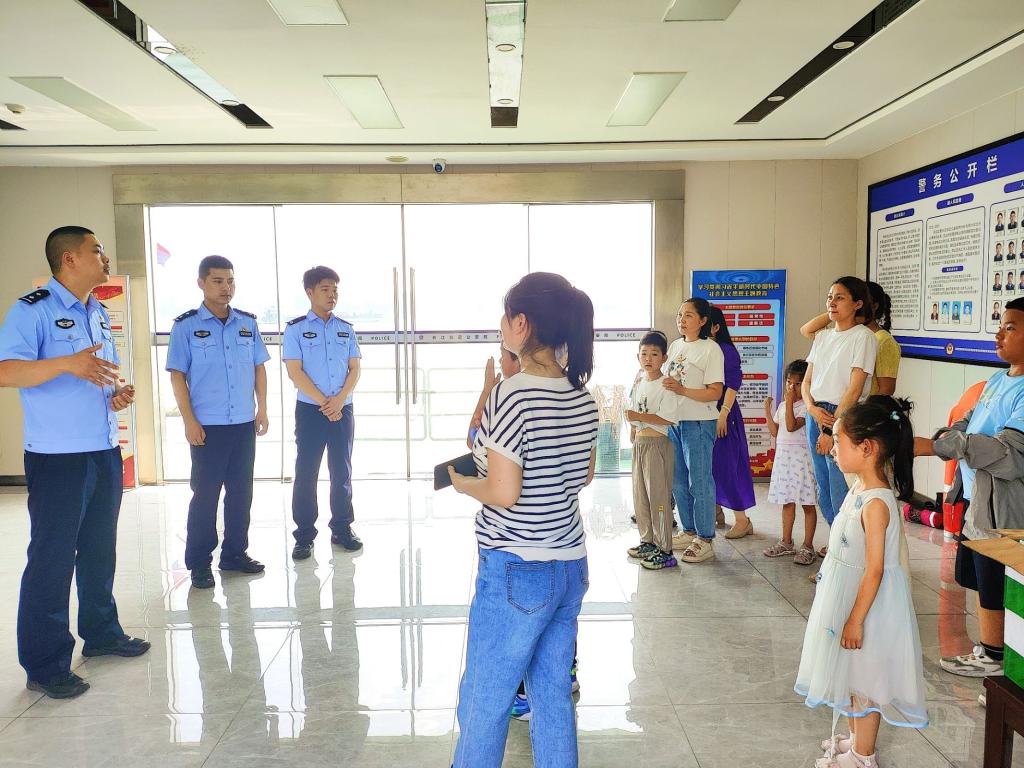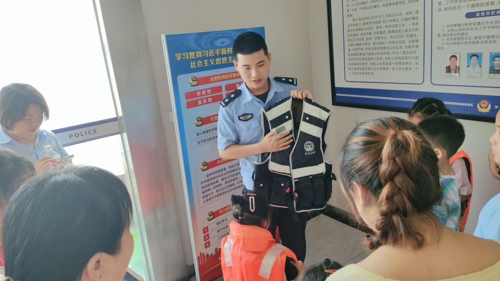 活动当天,小朋友们在民警的引导下,首先参观了荆州派出所的荣誉室。在这里,他们被派出所为维护水上安全、抗洪抢险等方面所做出的杰出贡献和荣誉成果深深吸引。墙上挂着的锦旗、展示柜里的奖杯和证书,无一不彰显着派出所的辛勤付出和辉煌成就。