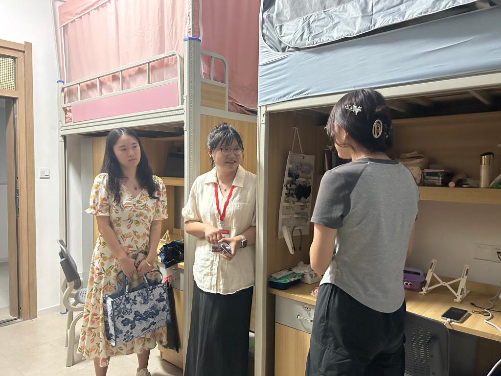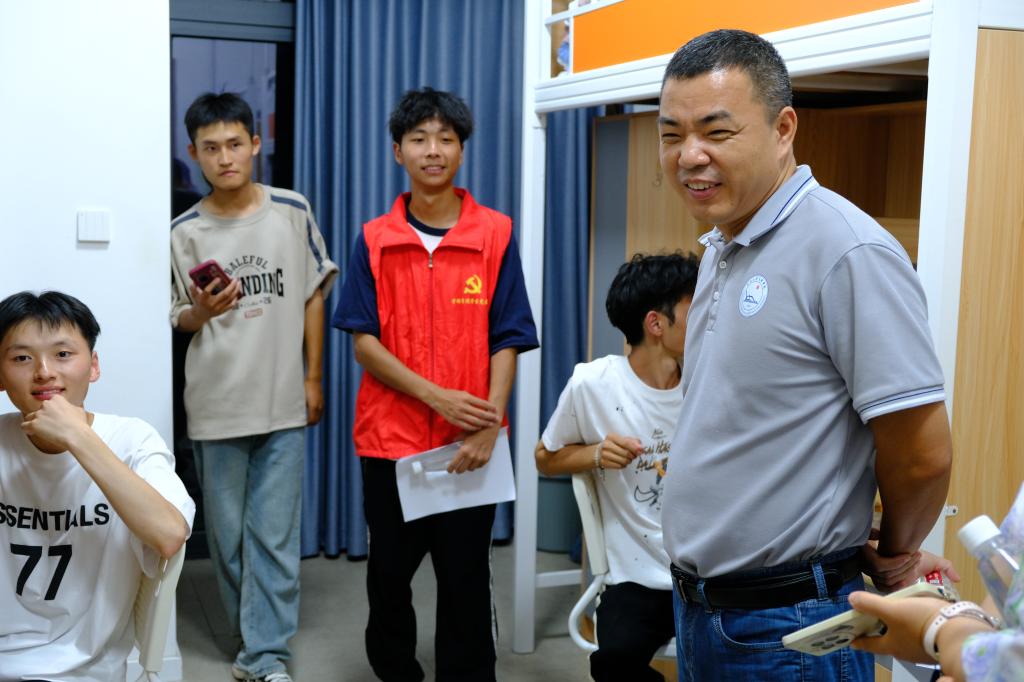 在女生宿舍,胡沿林特别关注了新生们的生活适应情况,详细询问了宿舍设施是否完善、饮食是否习惯等问题。她叮嘱新生们要注意安全,保持良好的生活习惯,遇到困难要及时向公司反映,公司会尽力为大家提供帮助。李晗明则向新生们介绍了奖学金评定、心理健康咨询、就业指导等方面的内容,鼓励新生们积极参与,充分利用公司提供的资源。最后,临走前不忘叮嘱同学们早点休息,为“开学的第一大关”——军训养精蓄锐。