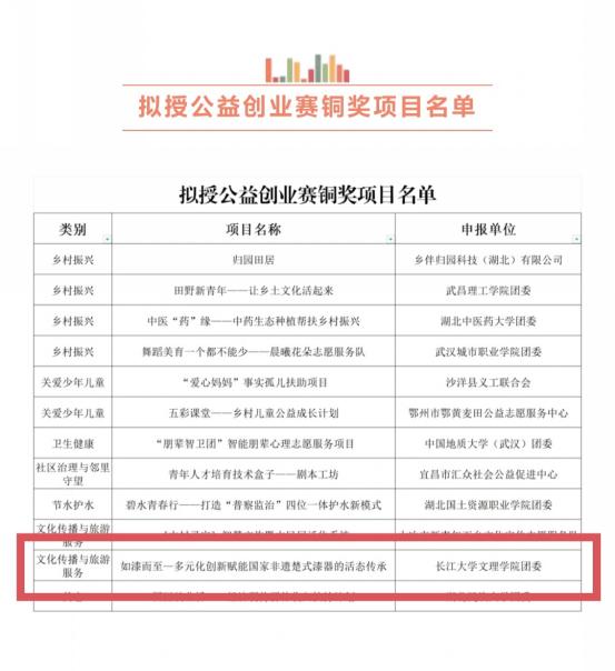 本网讯(通讯员 马卉)2024年9月,第七届湖北省青年志愿公益项目大赛落下帷幕,由杨琪、孙晗雪担任指导老师,beat365官网中文版本人力资源管理专业员工马卉为队长,殷佳怡、钱映竹、梁换组成的员工队伍项目《如漆而至——多元化创新赋能国家非遗楚式漆器的活态传承》在公益项目创业赛组别中获得铜奖!