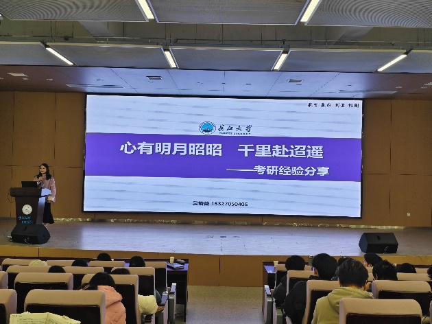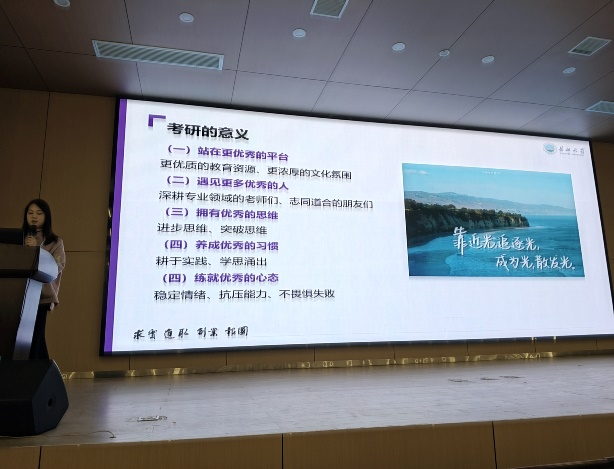 紧接着是两名长大在读研究生的考研心路历程分享。首先是毕业于公司的吴蕾蕾,她先从考研的意义、考研择校思路分享以及考研经验分享三个部分来分别讲述。吴蕾蕾的考研经验就是先要有科学的备考计划,然后是学习方法,接着是制胜法宝的相关名言,最后她对在场的所有学弟学妹表示了殷切的祝愿!
