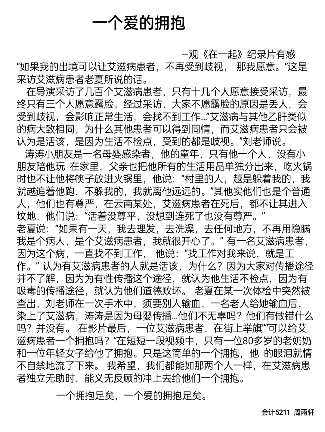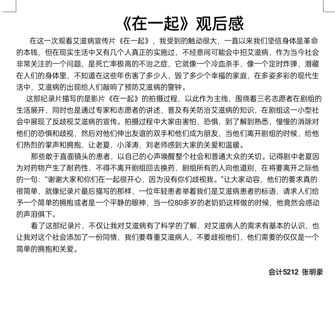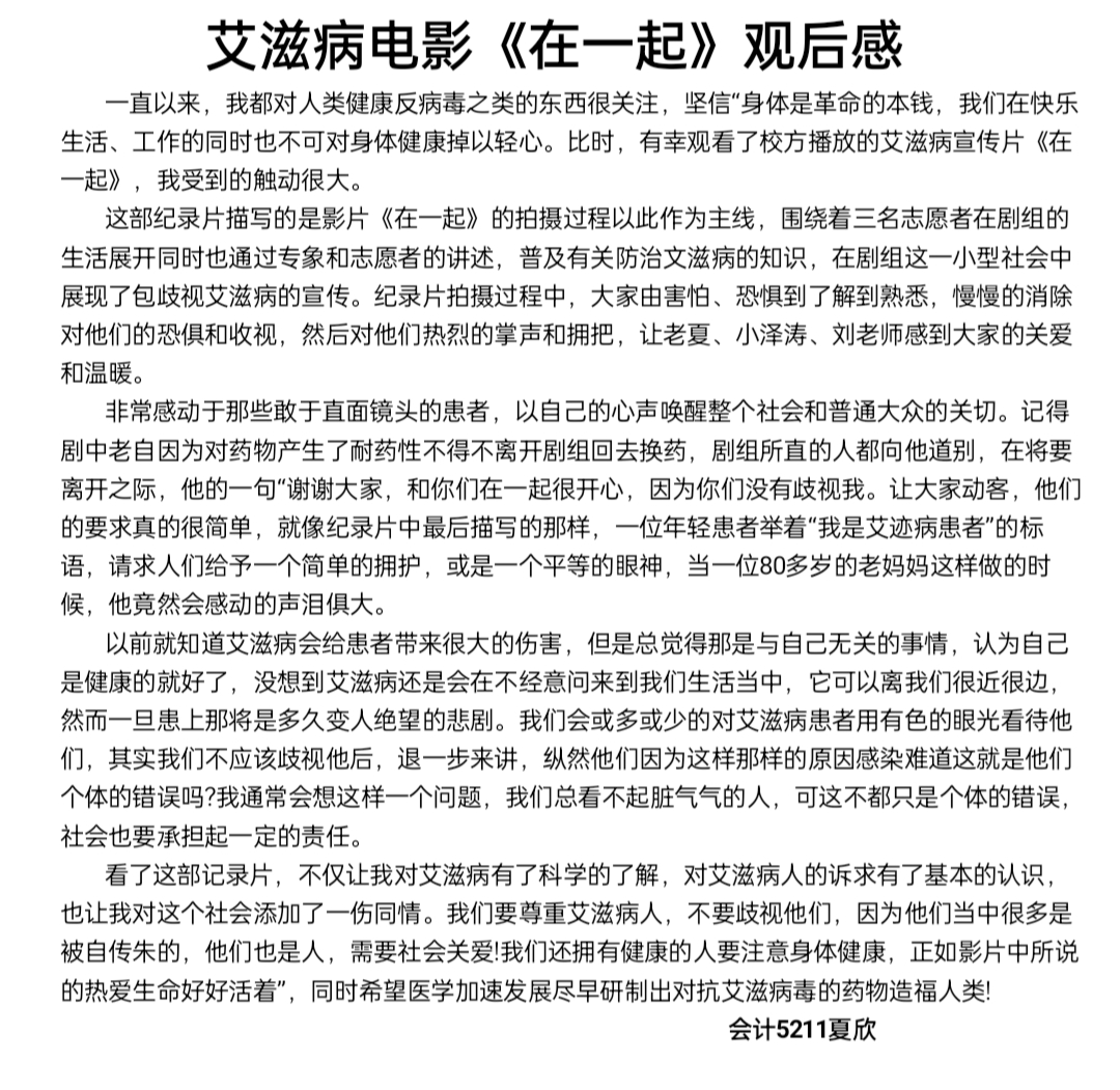 通过此次活动同学们对艾滋病有了更多的了解,也学会了应该如何正视艾滋病。以更好地遏制艾滋病的传播与蔓延,从影视中也展现了艾滋病病毒感染者与艾滋病病人热爱生活、珍视生命、积极向上的精神风貌。同学们表示此次活动的开展让我们受益良多,并且有着许多的感触,会计5212的张英豪表示“看了这部纪录片,不仅让我对艾滋病有了科学的了解,对艾滋病人的需求有基本的认识,也让我对这个社会添加了一份同情,我们要尊重艾滋病人,不要歧视他们,他们需要的仅仅是一个简单的拥抱和关爱。”亦有很多同学有着多样的不同感受,此次活动的意义重大,也圆满成功。在今后的学习工作中, 希望能够通过更多的活动让同学们增长知识,增加感同身受的热心和责任感。