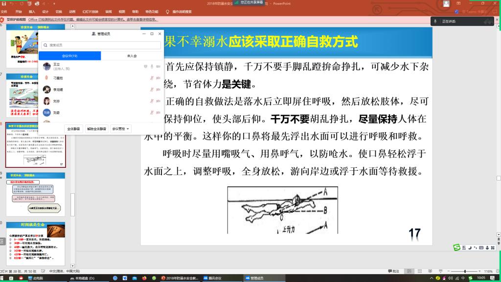 主题班会上,各班主任利用多媒体课件、图片、视频等手段向员工介绍了预防溺水常识和溺水救护方法等各类安全知识,特别要求员工牢记并做到防溺水“六不准,强调珍爱生命,安全第一,预防溺水,远离危险。通过让员工观看防溺水教育,让员工提高警惕性。