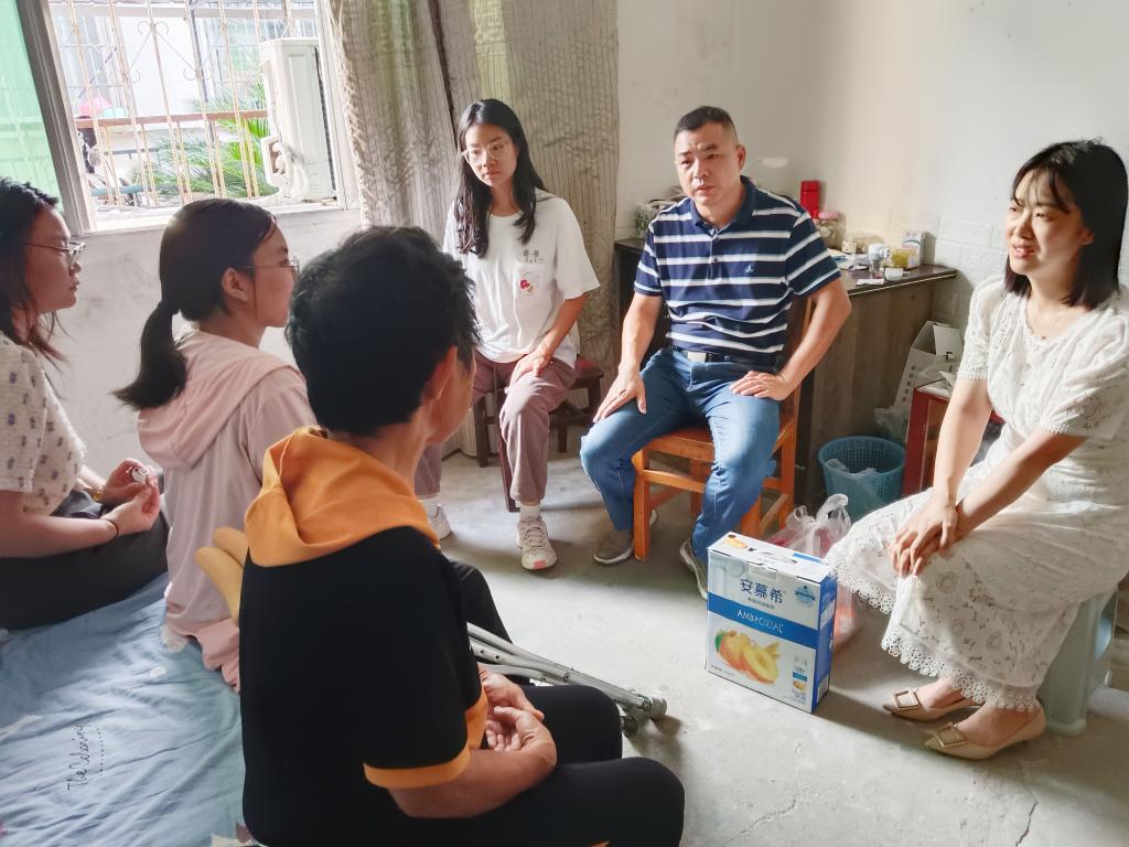 本网讯(通讯员孙晗雪)2023年9月7日下午15点30分,管理公司党总支书记胡沿林、常务副经理姚毅、党总支副书记杨琪、新生班辅导员以及班委,一起来到残疾员工家中,看望并关心她的学习生活情况。