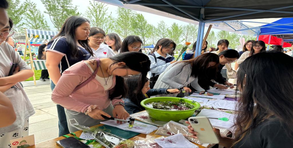 植物拓印体验区则弥漫着自然的气息与创造的乐趣。在专业指导下,同学们精心挑选形态各异的叶片花草,细心铺陈在棉布上,随后用小锤专注地敲打。清脆的敲击声中,植物的脉络、色彩被清晰地拓印下来,一幅幅独一无二的自然画作跃然布上。这不仅是动手实践,更是一次生动的自然美育与劳动教育融合课,员工们在创作中感受着自然的疗愈力量。