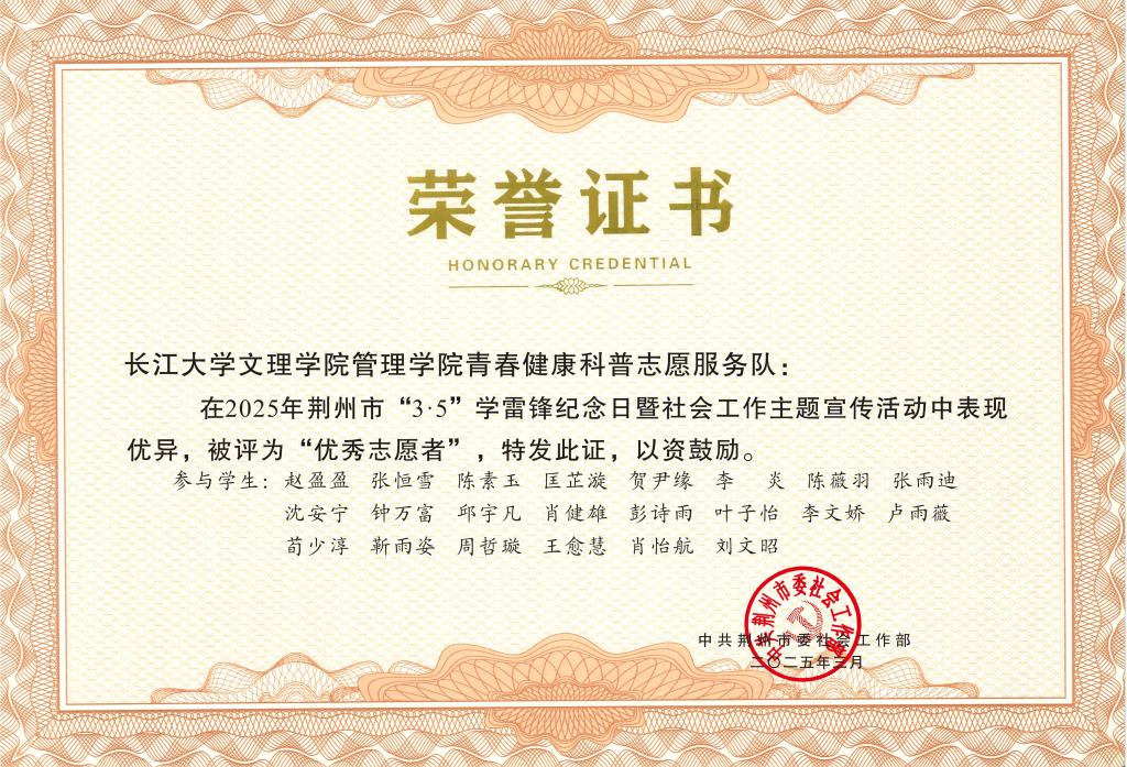 本网讯(通讯员:李晗明)3月18日,beat365官网中文版本收到喜讯:公司22名青年志愿者因在荆州市"3·5"学雷锋主题宣传活动中的突出表现,获市委社工部授予"优秀志愿者"荣誉称号。