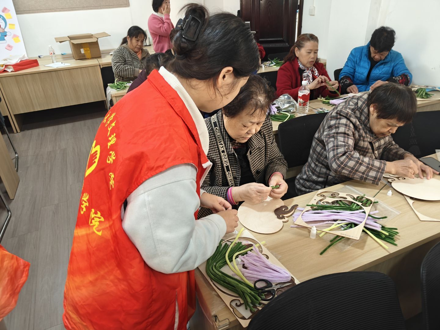 分组教学指导,定格美好瞬间。演讲结束后,志愿者们分成四个组,每组聚焦一种花朵样式,手把手指导老人完成手工制作。老人们在学习过程中充分体验手工乐趣,为晚年生活增添别样色彩。活动尾声,志愿者引导完成作品的老人们拍照留念,并为大家发放相应奖励。