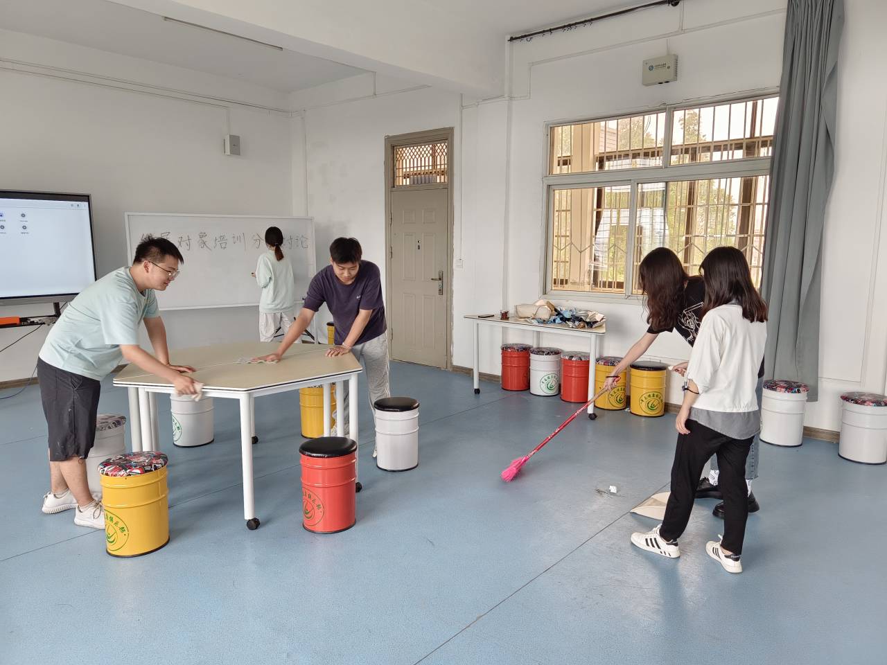 实践活动开始,发展对象针对“入党为什么,入党干什么?”以及“如何坚定理想信念,做一名合格的共产党员”等进行了分组讨论。讨论结束后,进行了教室卫生的打扫。大家拿着自己的抹布、扫把、簸箕等工具自行分组,有条不紊地打扫教室卫生,充分彰显了党员同志的先锋模范作用。在打扫卫生时胡春雪同志说到:“作为发展对象,我们要以身作则,努力学习和工作,时刻注意自己的言行举止,用实际行动践行一个共产党员的模范带头作用,做到吃苦在前,踏实肯干。”