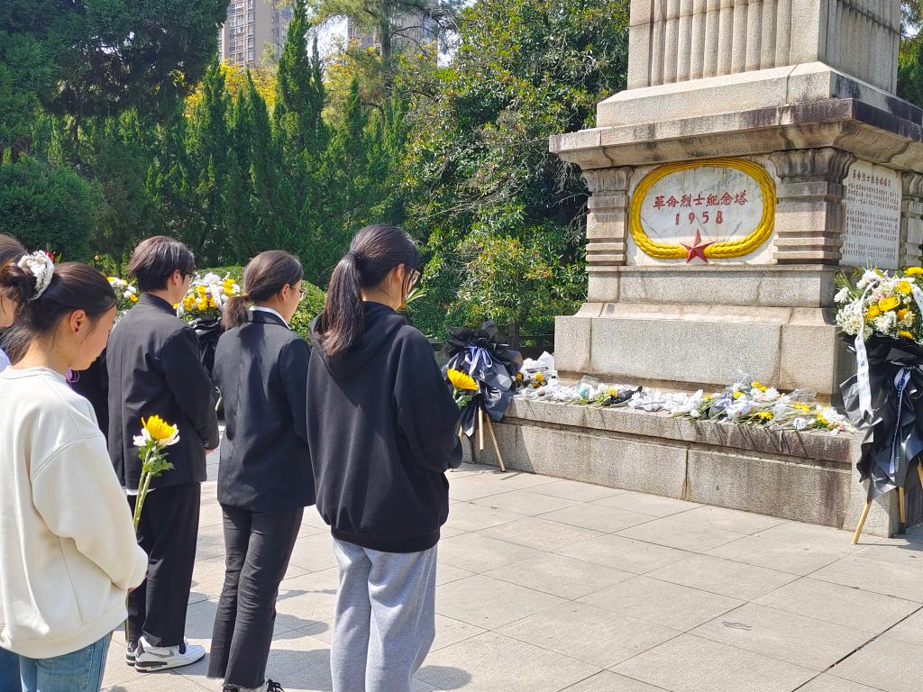 全体成员整齐列队,气氛庄重严肃,在革命烈士纪念碑前,伴随着哀乐集体默哀一分钟,表达对革命先烈的无限哀思。随后,同学们纷纷上前向革命先烈敬献鲜花,以示对先烈的崇高敬意。接着由万学君同志发表了题为《清明祭忠魂·青年当自强》的主题演讲。她深切回顾了革命先烈的英勇事迹,号召同学们继承先烈遗志,弘扬爱国主义精神,为实现中华民族伟大复兴的中国梦而努力奋斗。紧接着,大家在纪念碑和党旗前重温入党誓词,铿锵有力的誓言在陵园上空回荡,展现了同学们坚定的理想信念。全体党员同志集体朗诵了诗歌《清明的雨》,以诗意的语言表达对革命先烈的缅怀之情。最后大家近前瞻仰革命先烈纪念碑,详细了解革命先烈的光辉事迹,感受革命精神的伟大。