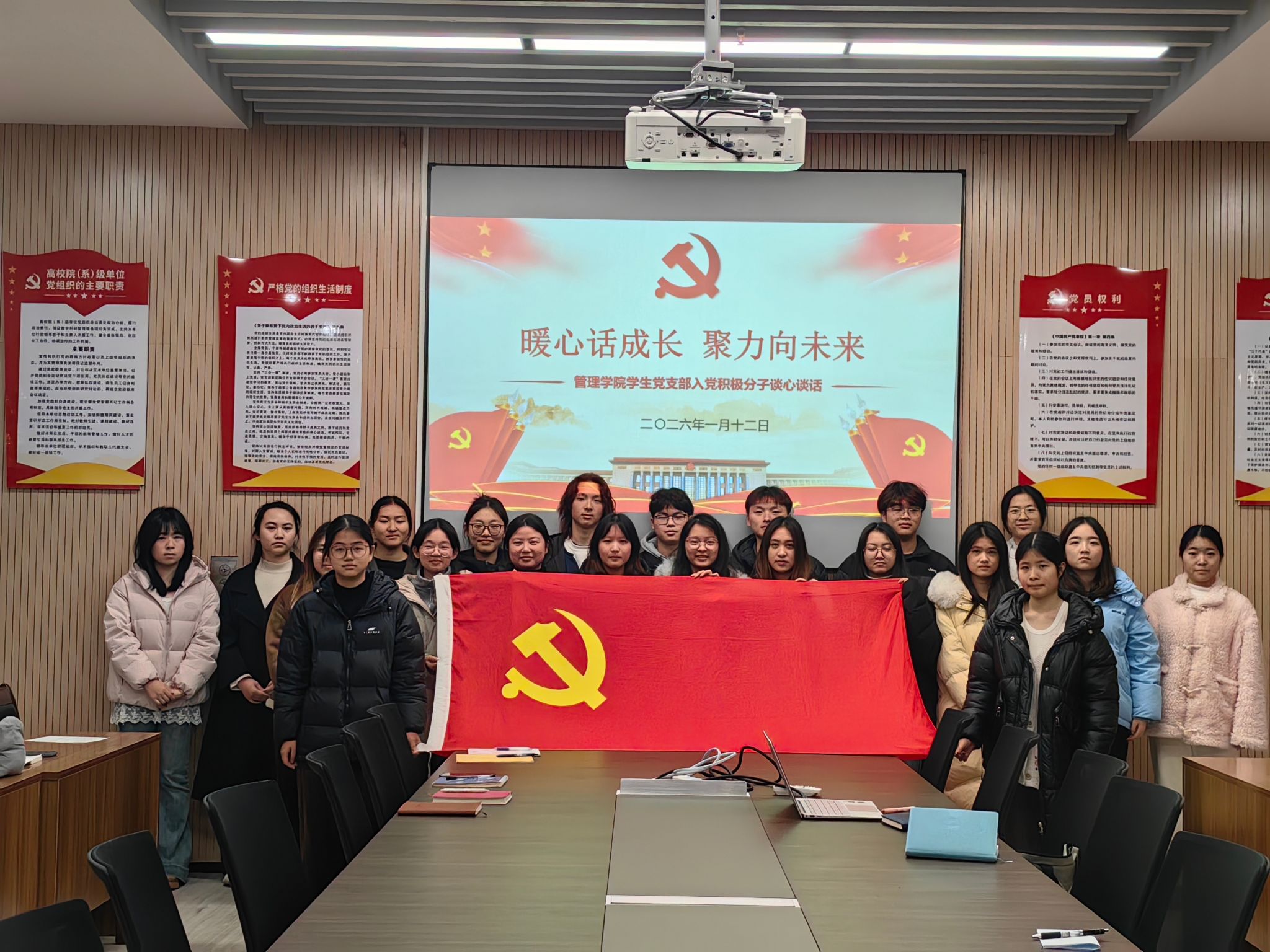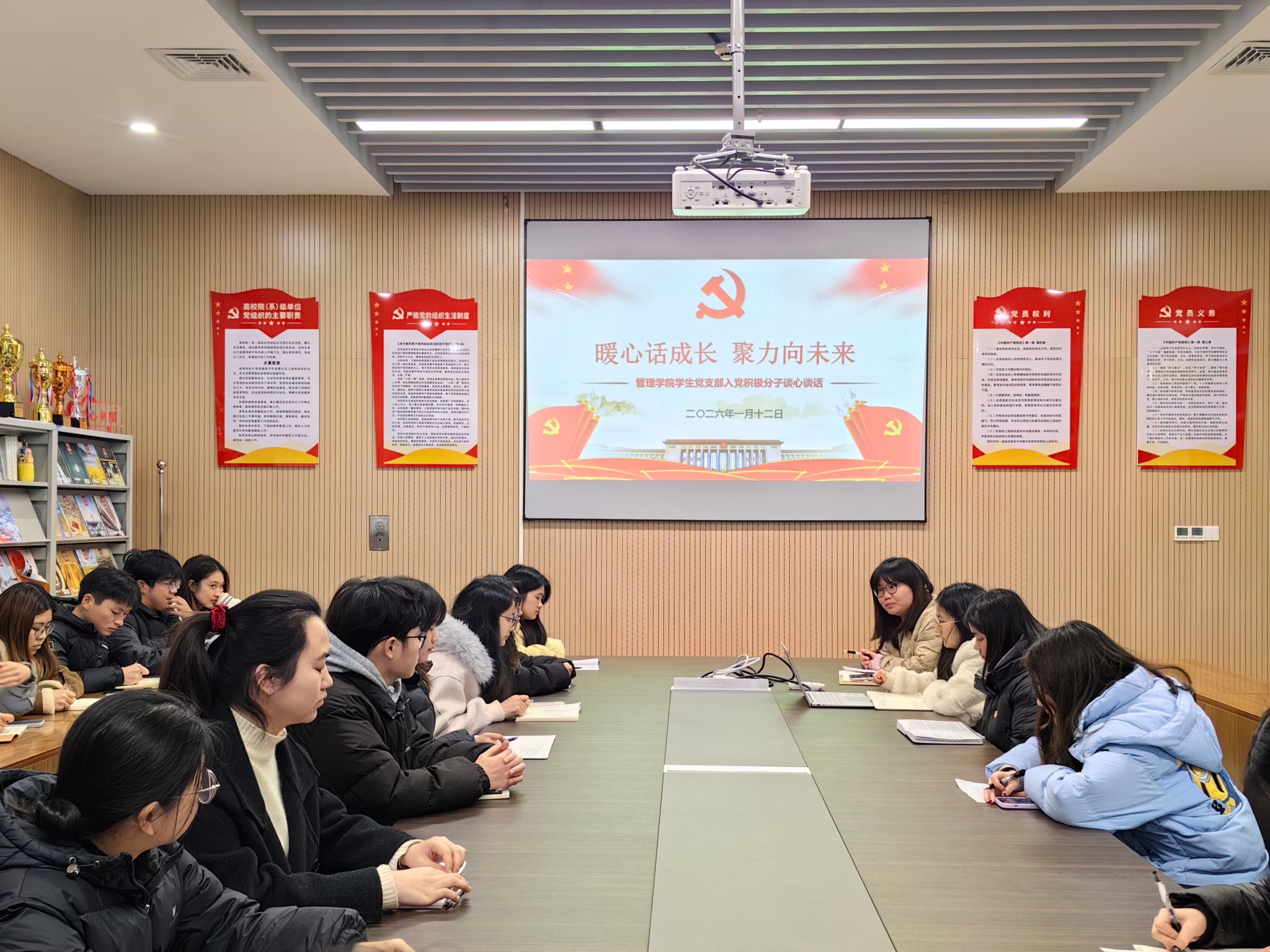 本网讯(通讯员 黄江琴)为进一步了解入党积极分子思想动态、学习状况和现实表现,进一步加强党员发展的培养与考察工作,筑牢党员发展质量。1月12日下午,beat365官网中文版本员工党支部在图书馆532会议室组织开展了“暖心话成长,聚力向未来”入党积极分子座谈会。会议由员工党支部书记杨琪主持,党支部组织委员兼纪检委员王希若、宣传委员万学君及29名入党积极分子参加会议。