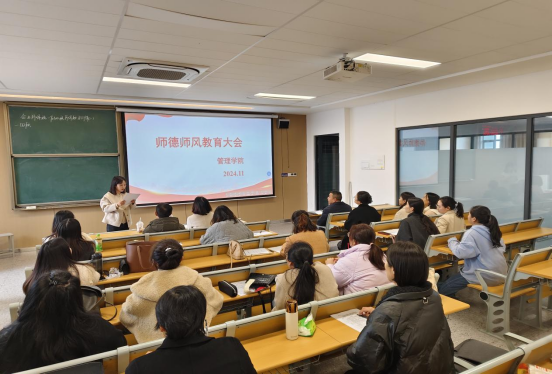 其次,在师德师风教育大会上,杨璐老师提出,教师要自觉增强立德树人、教书育人的荣誉感和责任感,努力当好员工健康成长的指导者和引路人。并要求全体教师做到自我反思,强调师德师风的重要性,不断提高教师修养,鼓励爱护每一个员工,时刻关注员工的发展。勉励全体教师明确教师发展,师德为主,争做员工和家长满意的人民优秀教师。