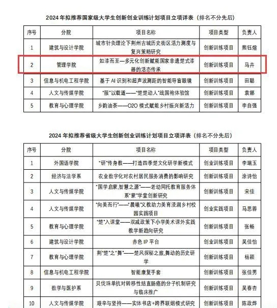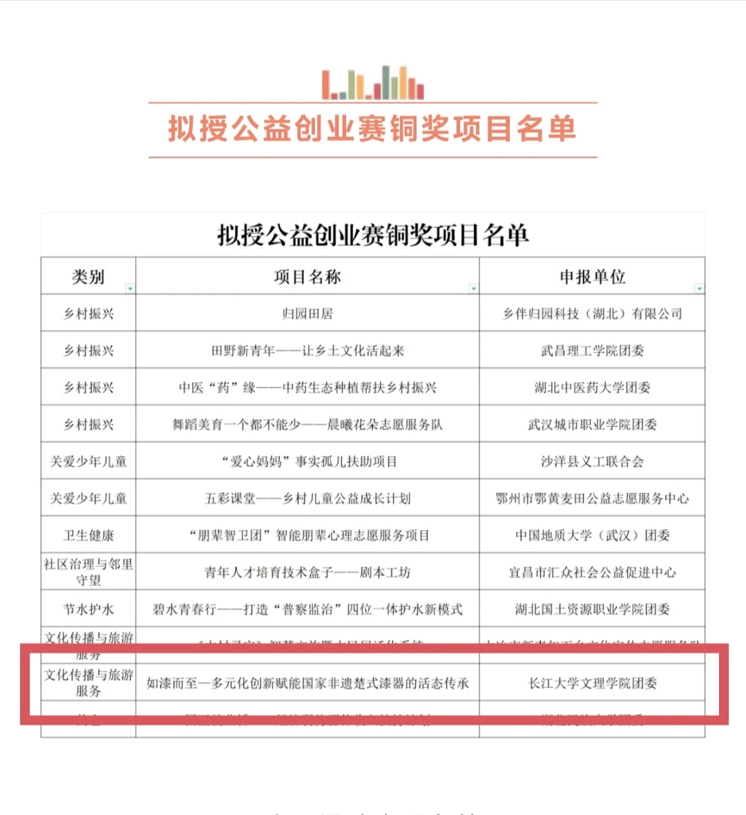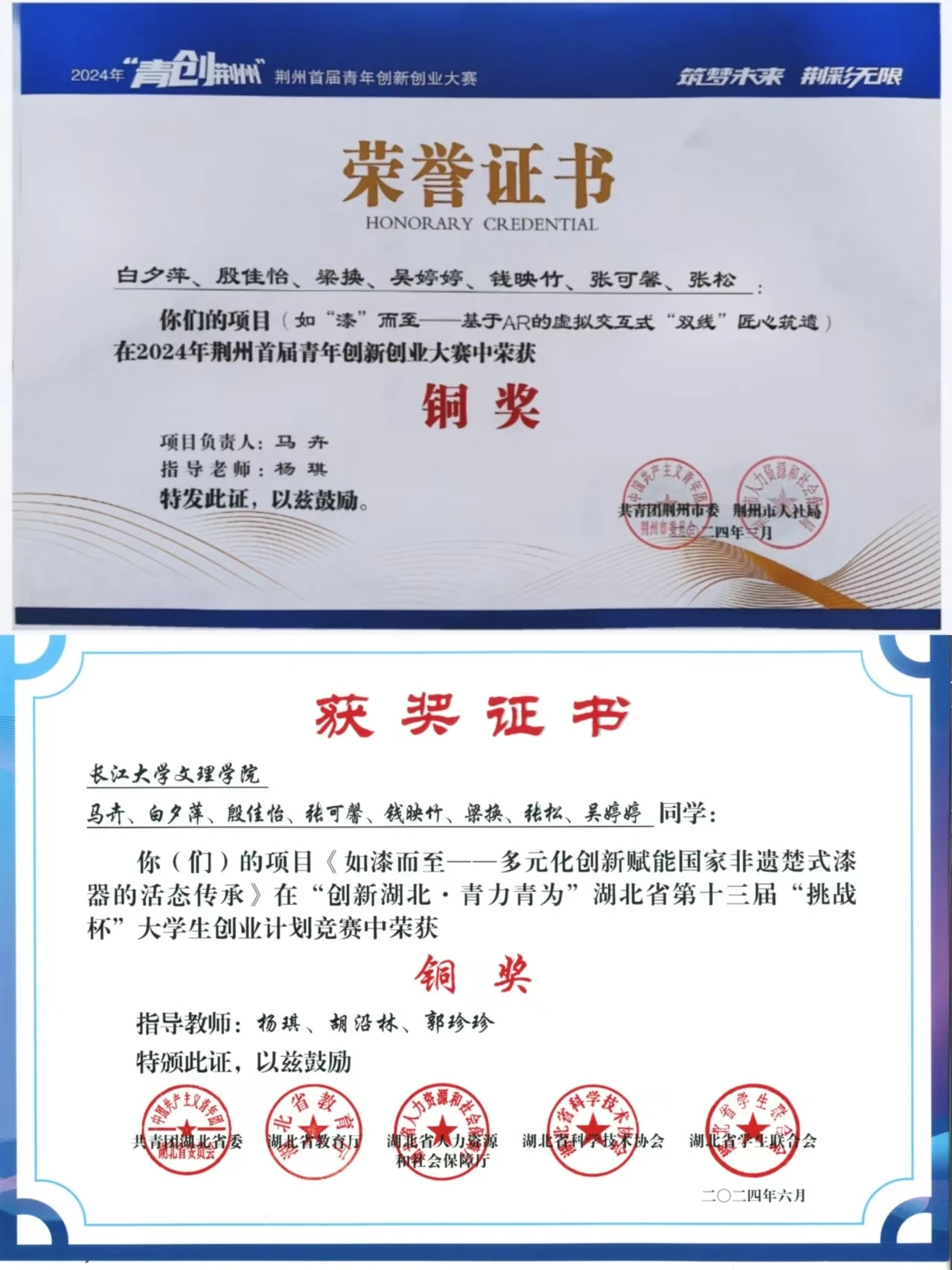 青年要有竞赛之梦。漆器作为重要文化遗产之一,具有极高的艺术价值和使用价值。但其市场发展活动力明显不足,怀揣着对楚文化与漆器的热爱,她组建了如漆而至项目团队,希望能对楚漆市场提供一些具有意义的建设方案。自团队成立后,她们奋战长达一年,200次集体围坐会议,30余次定期调研,10余次志愿宣讲,还有那无数个通宵的夜晚.....夜以继日的辛劳最终在一次次竞赛中开花结果,目前项目获得2024大创国家级立项,全国老员工三创赛省赛一等奖,“挑战杯”竞赛省级铜奖,首届青创荆州大赛铜奖,创客中国和创青春比赛中均获得省级优秀奖。经过在项目里的磨炼,她获得了宝贵的财富,那便是要在热爱中坚持,在坚持中才会遇见更好的自我。