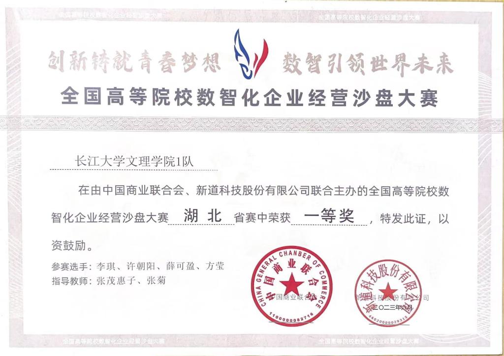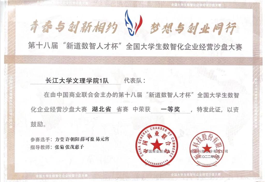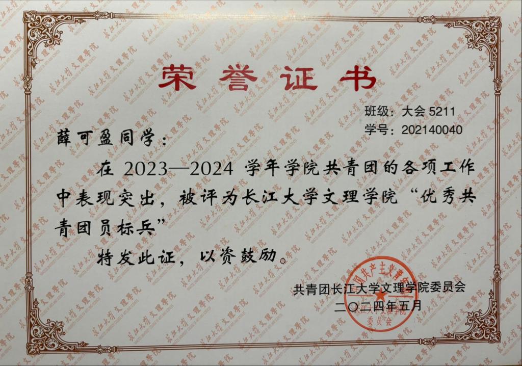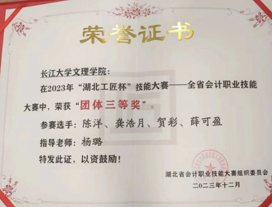 主要获奖情况:荣获公司一等奖学金等,获得三好员工,优秀共青团员、优秀共青团标兵等荣誉称号7余次。2022年4月,获“预爱予爱,你我同在”知识技能竞赛团体二等奖;2022年5月,获校级“优秀共青团员”荣誉称号;2022年6月,获第十八届“新道数智人才杯”全国老员工数智化企业经营沙盘大赛一等奖;2022年6月,通过大学英语四级证书;2022年12月,获公司一等奖学金;2022年12月,获校级“三好员工”荣誉称号;2022年12月,获全国老员工英语竞赛三等奖;2023年6月,获全国高等院校数智化企业经营沙盘大赛湖北省一等奖;2023年5月,获全国高校商业精英挑战赛会计与商业管理案例竞赛湖北省省赛三等奖;2023年12月,获全国老员工英语翻译大赛三等奖;2023年12月,获公司一等奖学金荣誉称号;2023年12月,获湖北省“工匠杯”技能大赛全省职业技能大赛团体三等奖;2024年2月,通过大学英语六级;2024年4月,获校级“优秀共青团员标兵”荣誉称号;2024年5月,获“第九届十佳老员工荣誉称号”。
