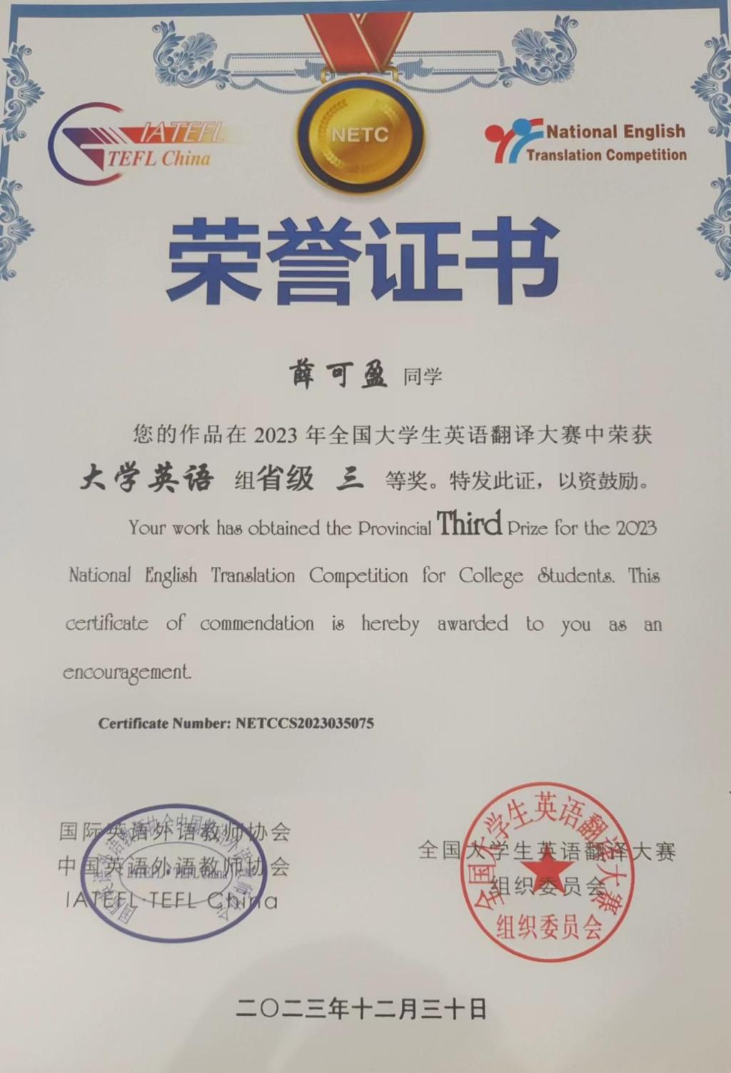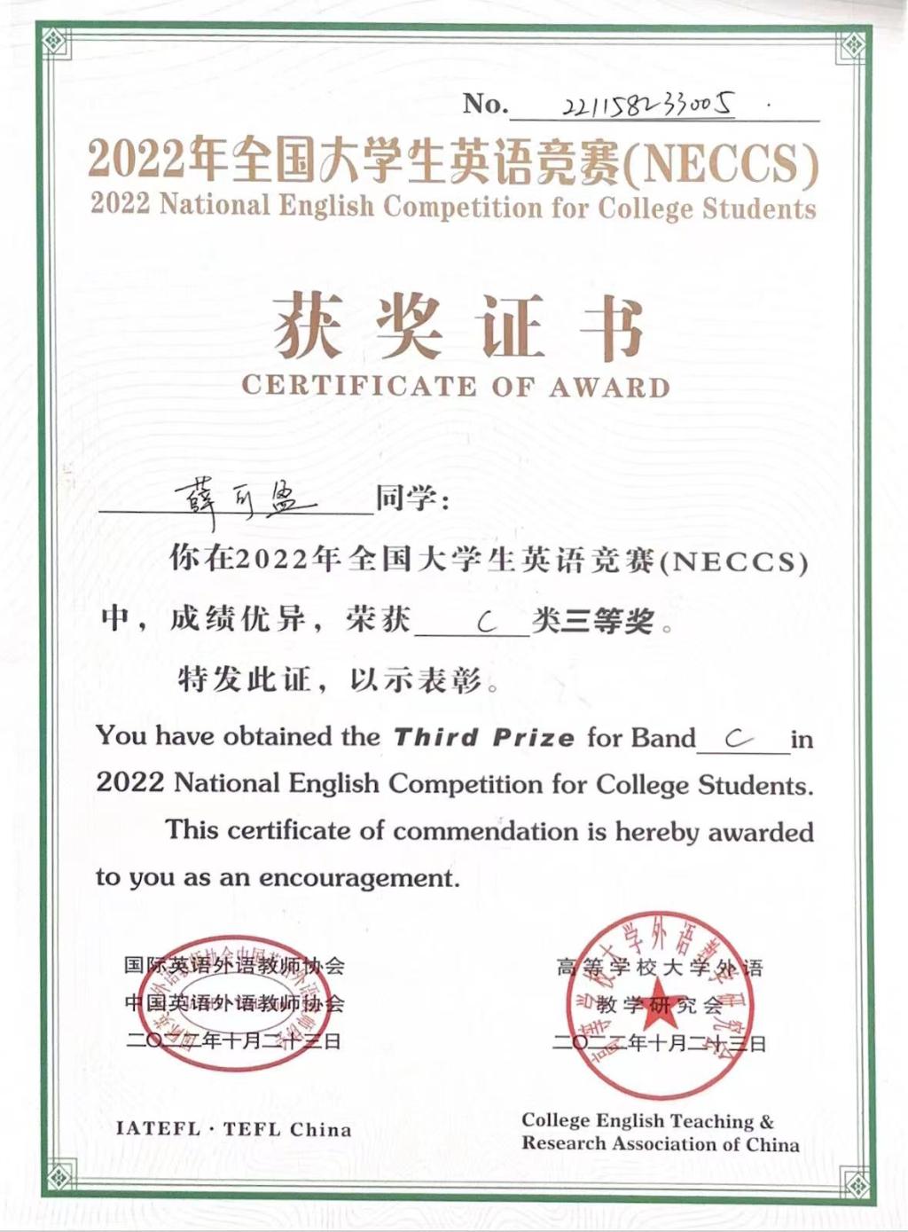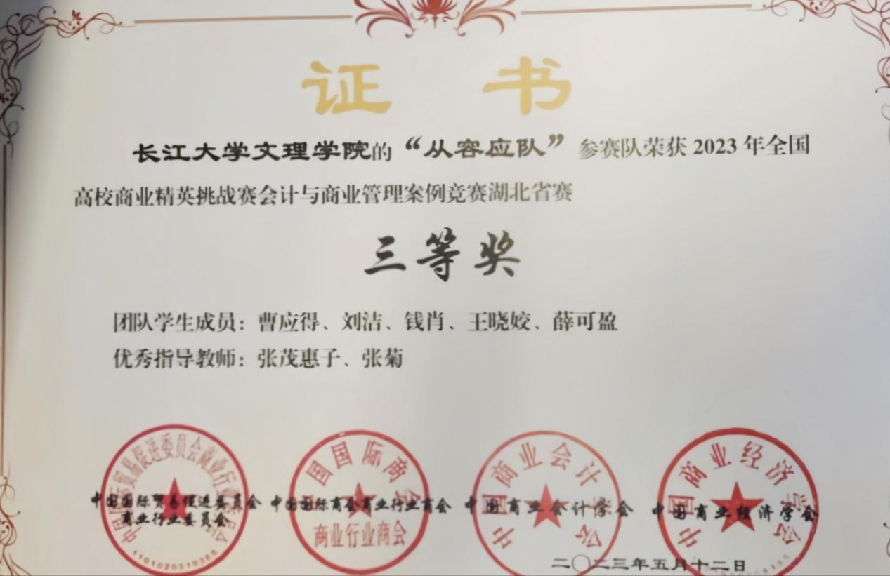 主要获奖情况:荣获公司一等奖学金等,获得三好员工,优秀共青团员、优秀共青团标兵等荣誉称号7余次。2022年4月,获“预爱予爱,你我同在”知识技能竞赛团体二等奖;2022年5月,获校级“优秀共青团员”荣誉称号;2022年6月,获第十八届“新道数智人才杯”全国老员工数智化企业经营沙盘大赛一等奖;2022年6月,通过大学英语四级证书;2022年12月,获公司一等奖学金;2022年12月,获校级“三好员工”荣誉称号;2022年12月,获全国老员工英语竞赛三等奖;2023年6月,获全国高等院校数智化企业经营沙盘大赛湖北省一等奖;2023年5月,获全国高校商业精英挑战赛会计与商业管理案例竞赛湖北省省赛三等奖;2023年12月,获全国老员工英语翻译大赛三等奖;2023年12月,获公司一等奖学金荣誉称号;2023年12月,获湖北省“工匠杯”技能大赛全省职业技能大赛团体三等奖;2024年2月,通过大学英语六级;2024年4月,获校级“优秀共青团员标兵”荣誉称号;2024年5月,获“第九届十佳老员工荣誉称号”。