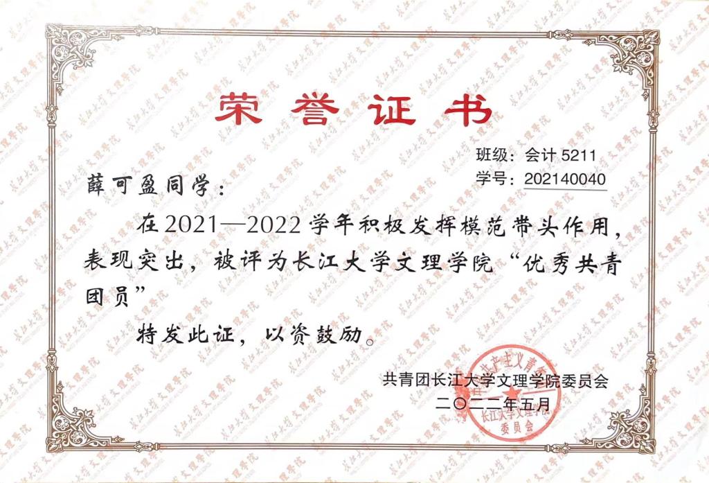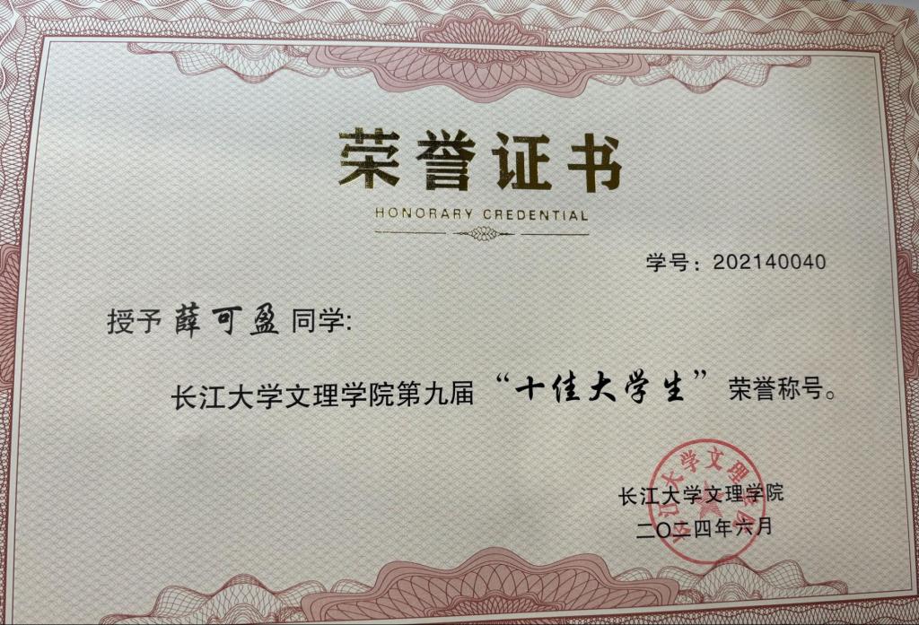 苔花如米小,亦学牡丹开。薛可盈同学表示这句话的意思是尽管吾辈老员工是平凡人,如空气中的尘埃一样渺小,如石头上的青苔一样不起眼,却可效仿苔花,虽如米小,也学牡丹开,承担起责任与担当。笃学不倦,攀登学术巅峰—方成中坚之才,自踏入文理学堂以来,她以优秀的学长学姐为榜样,从他们的身上汲取笃行的力量,经过不懈努力,连续两个学年,专业成绩与综合测评成绩均列第一,三学年平均绩点3.96,专业课98%达85分及以上,连续两年获得公司一等奖学金,被评为三好员工。除了在专业学习上的努力,英语方面的学习也一直在路上。四六级顺利过线,其中四级听力接近满分;此外,她积极参加英语类学科竞赛,均取得不错的佳绩。当然,抬头望骄阳长空,跬步行追光之路,在初级会计师考试中,双科顺利过线近20分。“人生是旷野而非轨道”,在这片创新的旷野上,除了有学识,还要潜心科研-勇闯创新前沿,在2023年12月她参加了湖北省工匠杯-会计职业技能大赛;初赛,同297家企事业单位、院校共9139名参赛者进行专业知识的角逐,成功晋级决赛,最后环节,薛可盈将所学的专业知识在财会业务技能竞赛和涉税业务技能竞赛运用至尽,荣获三等奖的好佳绩。 摸着初心与热情,她与数智化双向奔赴。其中,在第十八届“新道数智人才杯”全国老员工数智化企业沙盘大赛中,她紧跟跟随团队在省赛赛场上披襟斩击,最终成绩超越数十所高校,约100只队伍,成功晋级国赛。至此,薛可盈两次参加全国高校数值化企业沙盘大赛均获一等奖。生逢其时勇争先,踔厉奋发立潮头,2021年的夏天的开学典礼,让她便有了志向,志在入党,志在为党;在思想上,她有着明确的政治立场,遵纪守法,勇于自我反思和自我批评,为社会主义建设奉献绵薄之力。作为一名青年学子,薛可盈铭记自己的任务使命,她曾担任社团协会副会长,带领团队外出参加比赛,为校争光;同年,承蒙关照,我荣获第九届“十佳老员工”的荣誉称号。