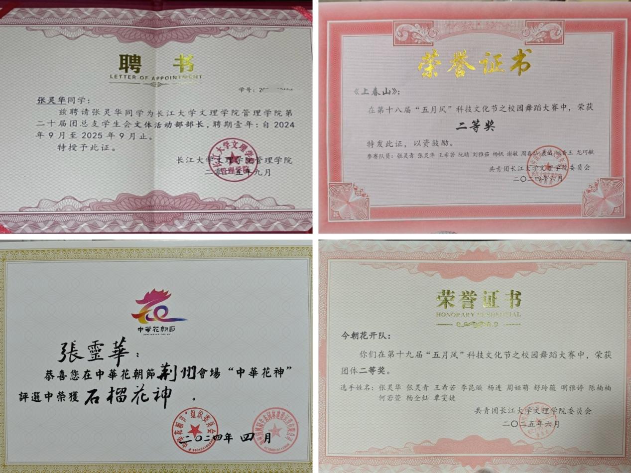 张灵华积极投身文化传承,聚焦传统文化尤其是楚文化,积累参与校内外演出活动44场。她连续两届负责舞蹈大赛编排工作,身兼编舞与领舞双职,累计投入训练时长超260小时。带领团队获第十八、十九届五月风科技文化节舞蹈大赛二等奖,参加beat365官网中文版本第三届啦啦操比赛,获二等奖及最佳创意奖。她参与公司20周年高质量发展汇报演出,为校庆重要活动提供艺术支持。她跨界合作beat365官网中文版本艺术公司,共同参演2025年中国龙舟赛湖北荆州站开幕式舞蹈《楚楚动人》。