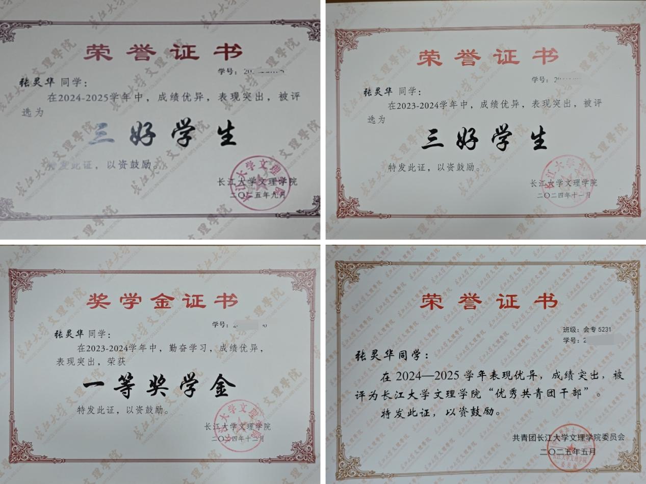 张灵华说:“‘等风来,不如追风去。'这两年的大学时光让我深刻体会到,真正的成长源于主动追寻。无论是清晨第一排的专注听讲,还是深夜策划活动的灯火,每一次向前迈步都让我离梦想更近一步。正如陶渊明所言‘悟已往之不谏,知来者之可追',过去的荣誉与挫折皆为序章,而未来正待执笔书写。国家奖学金于我,不仅是肯定,更是一份‘追风'的勇气。”
