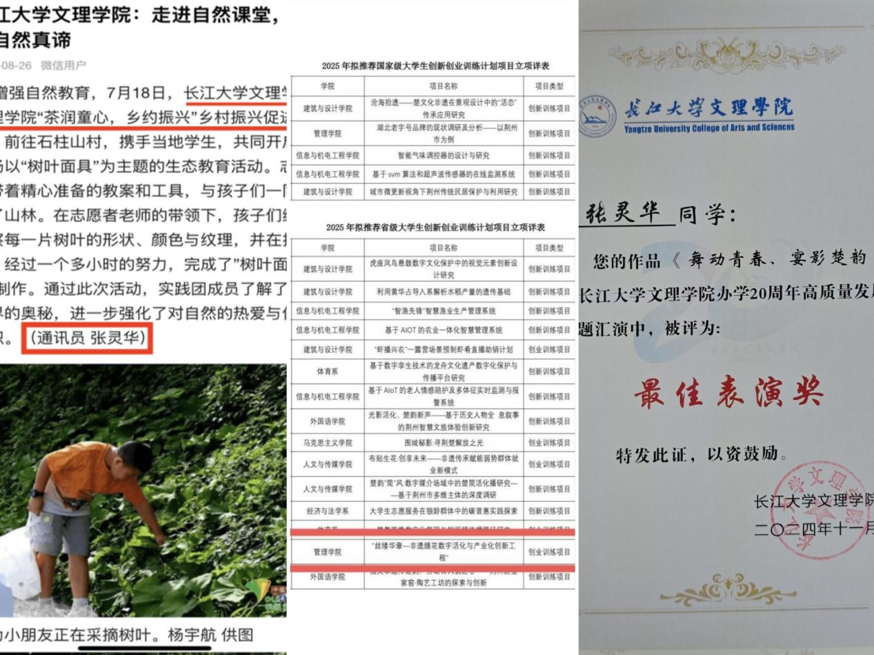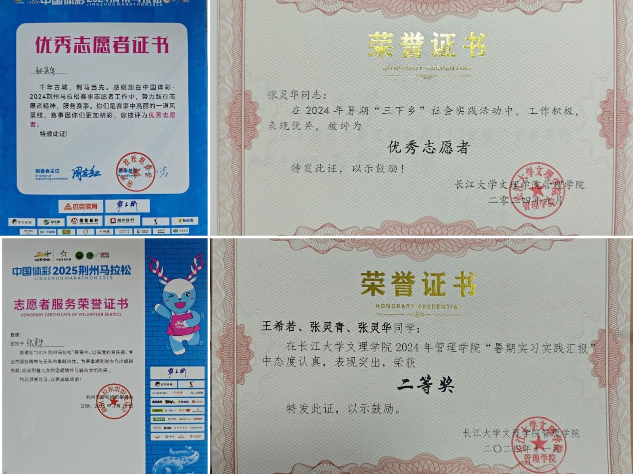 张灵华积极投身于志愿服务活动,先后参与了两届荆州市马拉松、荆州市禁毒宣讲等多项大型志愿服务活动;同时还积极组织了暑期三下乡——“茶润童心,乡约振兴”乡村振兴促进团,走进公司乡村振兴帮扶点,用脚步丈量乡村,累计行程231.47公里,走访5个传统村落,个人累计志愿时长293小时,在中青校园网发表国家级新闻一篇,荣获共青团中央授予的2024年全国老员工“三下乡”社会实践活动优秀团队表彰,也是全校首次斩获该项国家级荣誉。