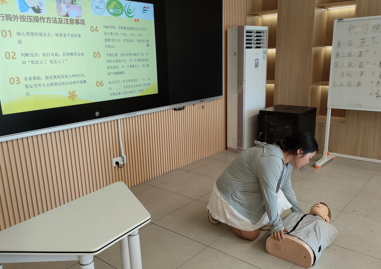 在讲解心肺复苏(CPR)这一关键急救技能时,同伴社成员们不仅详细阐述了CPR的操作原理和流程,还利用模拟人进行现场演示。他们一边操作,一边强调每一个动作的要点和注意事项。他们详细介绍了心肺复苏急救法的理论知识,从判断现场环境安全、确认患者意识和呼吸,到胸外按压的位置、频率、深度,以及人工呼吸的操作要点,每一个步骤都讲解得细致入微。