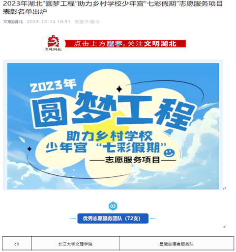 本网讯 今天(12月14日)从高职部获悉,晨曦志愿者服务队2023年湖北“圆梦工程”助力乡村公司少年宫“七彩假期”志愿服务项目优秀志愿服务团队。