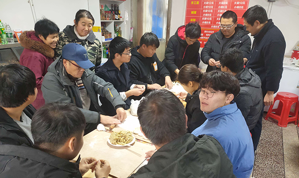 在西校区附近的一家餐馆,朱继平带来了自费为师生购买的水果和零食,并与大家围坐一圈,一边示范包饺子的过程,一边围绕生活、学习等话题与大家展开交流。“兴趣爱好是什么?”“课余时间怎么度过?”“平时生活费是多少?”“公司饭菜合不合口味?”朱继平一边擀面,一边与员工话家常,询问具体情况。他叮嘱同学们注意天气变化,保重身体,以良好状态迎接期末各项工作,交待他们经常与家里保持联系,及时告知父母在公司的情况,让家长放心。