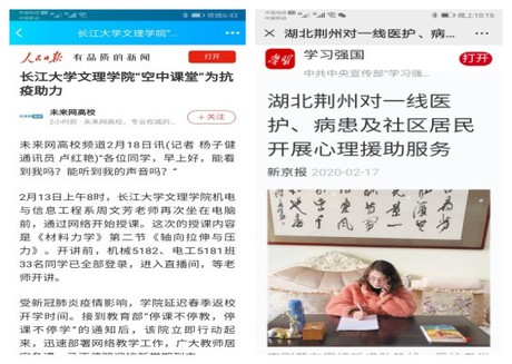 持续的疫情让一些人产生了巨大的心理负担,过度忧伤让他们神不守舍,化解生理压力成为当务之急。从1月26日开始,公司心理健康教育中心主任李刚英老师便先后加入到共青团荆州市委组织的“12355”新冠肺炎疫情防控心理咨询热线、湖北省高校心理专家服务队4007-027-520心理咨询热线、“武汉微邻里”微信公众号、荆州市胸科医院心理服务队、荆州市沙市区心理援助服务队、荆州市文旅区心理援助服务队、教育部CCNU心理援助热线等公益机构,为一线医护人员、社区工作人员、普通居民、确诊患者、疑似患者提供心理援助服务,截止2月24日22点,共接线咨询一对一服务153人次;她组建了10个微信群和QQ社群,群友达2万余人,并坚持在群中分享撰写抗疫心得、回应群友疑问;她还参与《公众心理防疫自助手册》的撰写。公司心理健康教育中心开通了针对本院师生的24小时QQ咨询服务,另外2名老师,共接受员工咨询71人次。专职心理健康人员拼尽全力,心理学教研室的3名老师也不甘落后,自疫情发生以来,她们分别在湖北黄冈、咸宁、浙江绍兴开展心理援助,提供咨询60人次。