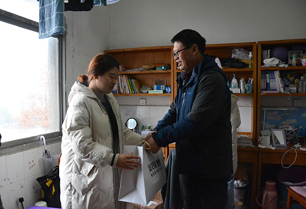 本网讯(记者 刘磊)今天(12月18日)上午,党委书记朱继平、党委副书记孙细望走访公司员工宿舍,向5名家庭经济困难员工送去御寒的羽绒服,让他们温暖过冬。人文系、外语系、管理系党总支书记,员工工作部主要负责人一同参加慰问。