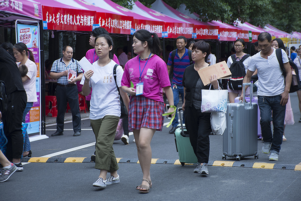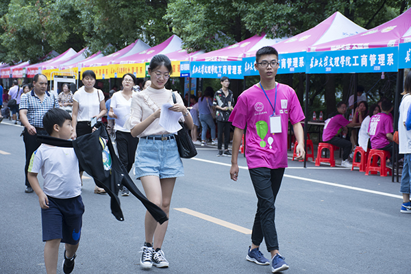 下午2点,550名迎新工作人员全部到位,分别在入学资格审查处、绿色通道办理处、缴费处、校外接待点等岗位做好准备工作。新生报到流程图、车辆引导图等各类指示展板与宣传条幅布置妥当。