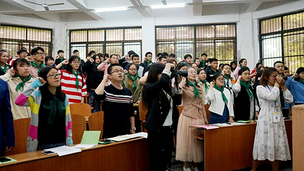 师生佩戴团队标识 志愿者代表宣誓