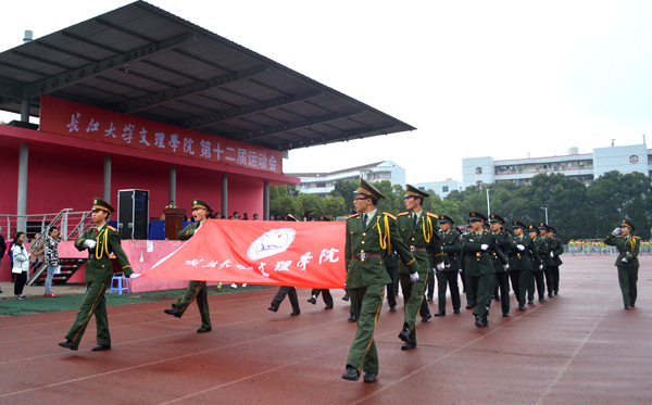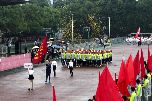 本网讯(记者 吴秀丽)10月23日上午,在公司第十二届运动会开幕式上,由院国旗护卫队组成的国旗方阵和院旗方阵、由医药与护理系员工组成的鲜花方阵、由机电与信息工程系员工组成的红旗方阵、由师生代表组成的裁判员方阵以及7个系部运动员方阵依次亮相。