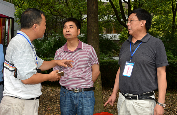 梅平与郭睦庚(中)、郭明虎(左)交流完善校园环境建设的想法