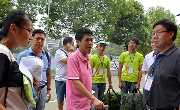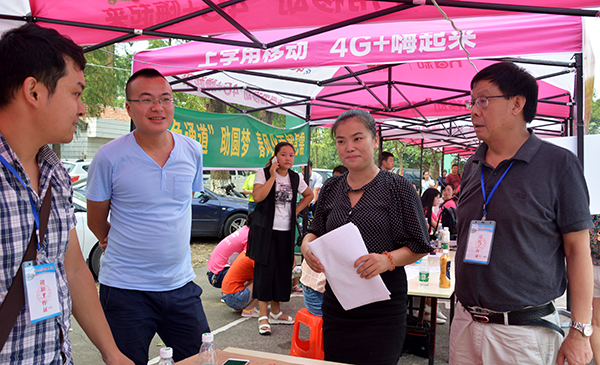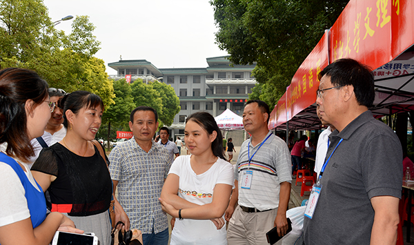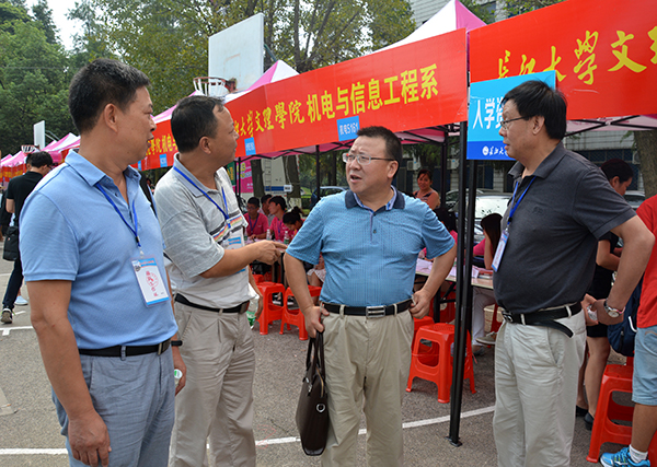 在城中校区迎新点,梅平、郭明虎与副经理郭睦庚交流了关于完善校园环境建设的想法;听取了员工工作处负责人汇报新生入学报到的情况;依次来到工商管理系、外国语系、人文与传媒系了解新生报到情况。