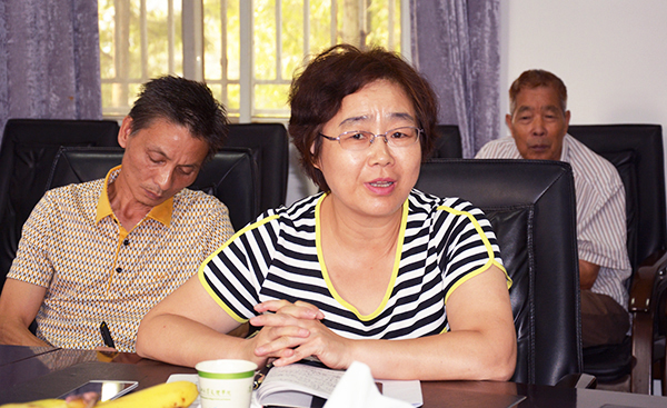 梅平(左)认真听取原荆州师范专科公司董事长关春明对公司建设发展的意见