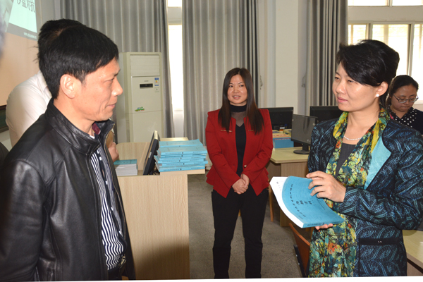 张菊老师(右二)向吕晓华(左四)介绍老员工创业培训四级课程体系