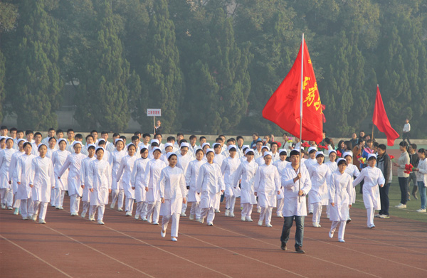 在激昂的运动会进行曲中,庄严的五星红旗在晨风中高高飘扬。国旗手们英姿飒爽 ,步伐矫健整齐。鲜花队员手捧着五彩缤纷的花束,面带微笑,走向主席台,向运动会献礼;红旗方阵,高举五星红旗向主席台敬礼;系部方阵着装整齐,气势昂扬。